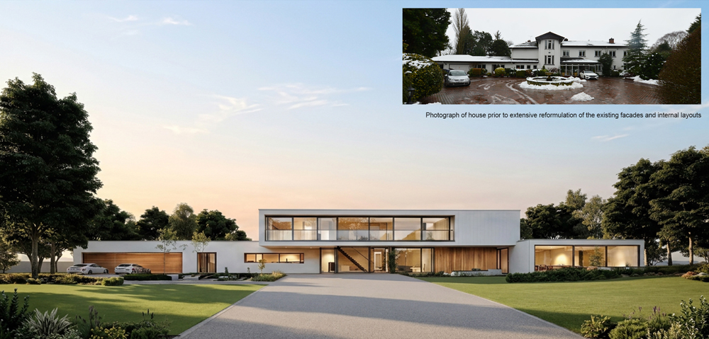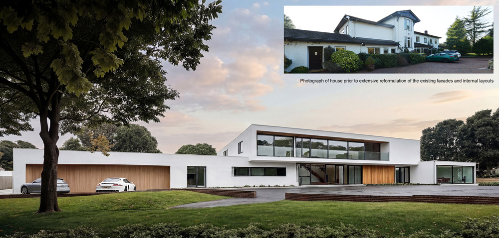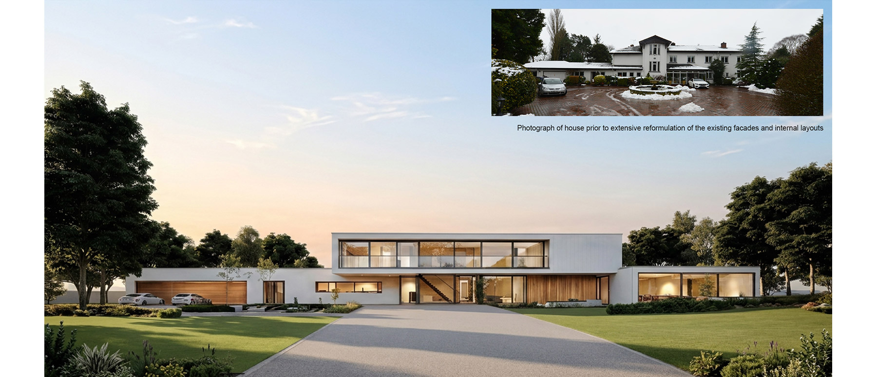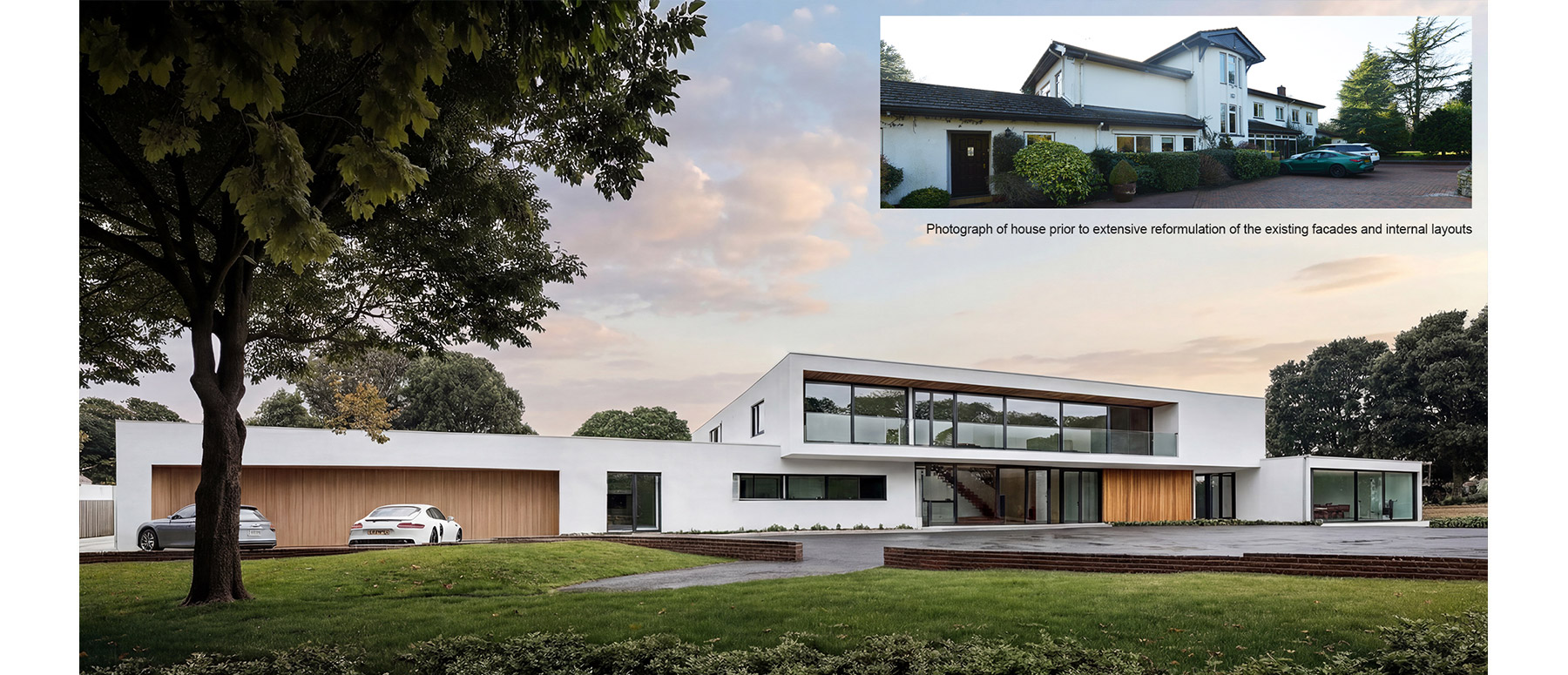 Located on a large mature site in the green belt on the outskirts of Wolverhampton, the existing house is situated in the centre of the site as the land drops away to the rear boundary. The brief was for a large contemporary house including significant leisure facilities (games room, swimming pool, gym and music room) and a self contained flat. As the house was of sound construction, to save overall costs and utilise less resources for environmental reasons, the existing house was largely maintained and extended where required, with a complete transformation of the exterior aesthetic of the house undertaken to convert it into an exciting contemporary dwelling.