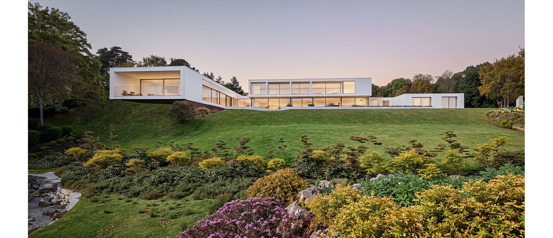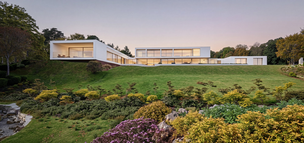 White render was chosen as the external material due to its ability to easily and cost effectively unify the existing house with the new extended areas so that the whole house could be read as one overall aesthetic and give the appearance of a completely new house. Elements of quality oak external panelling add to the contemporary feel and soften the crisp modern white form.