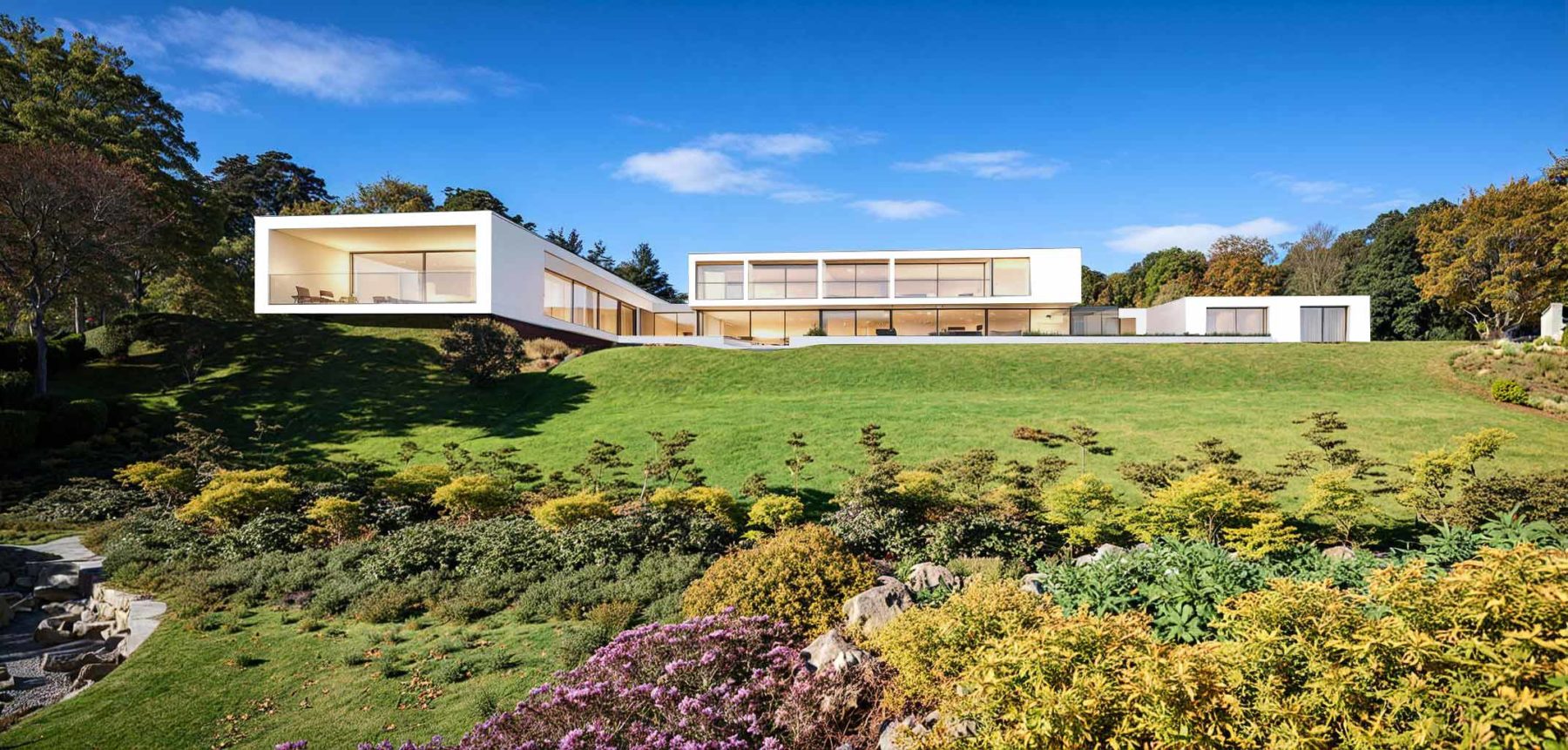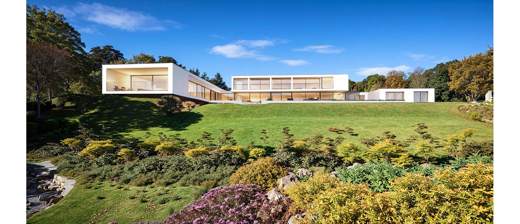 The leisure facilities were grouped together in a new linear dynamic on the west side of the site orientated perpendicular to main body of the house. This allowed the swimming pool and the main living spaces to address and utilise the large rear terrace and subtly interact with each other, forming the party space desired by the client. The leisure wing extends far enough into the rear garden that it cantilevers over the slope to make the most of the stunning views.